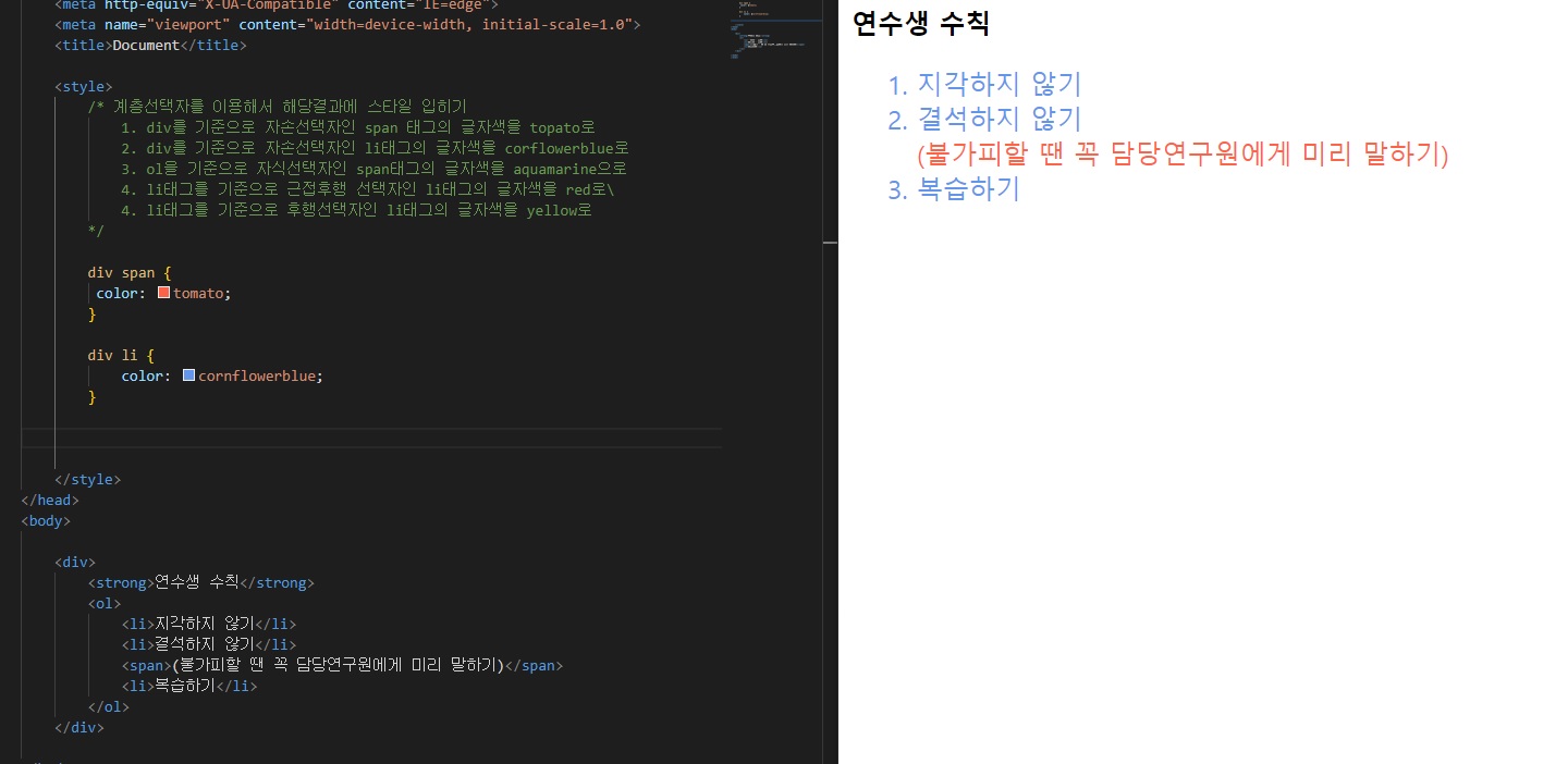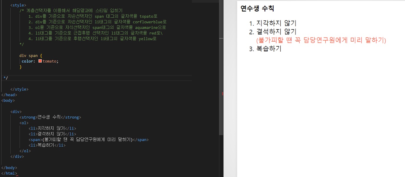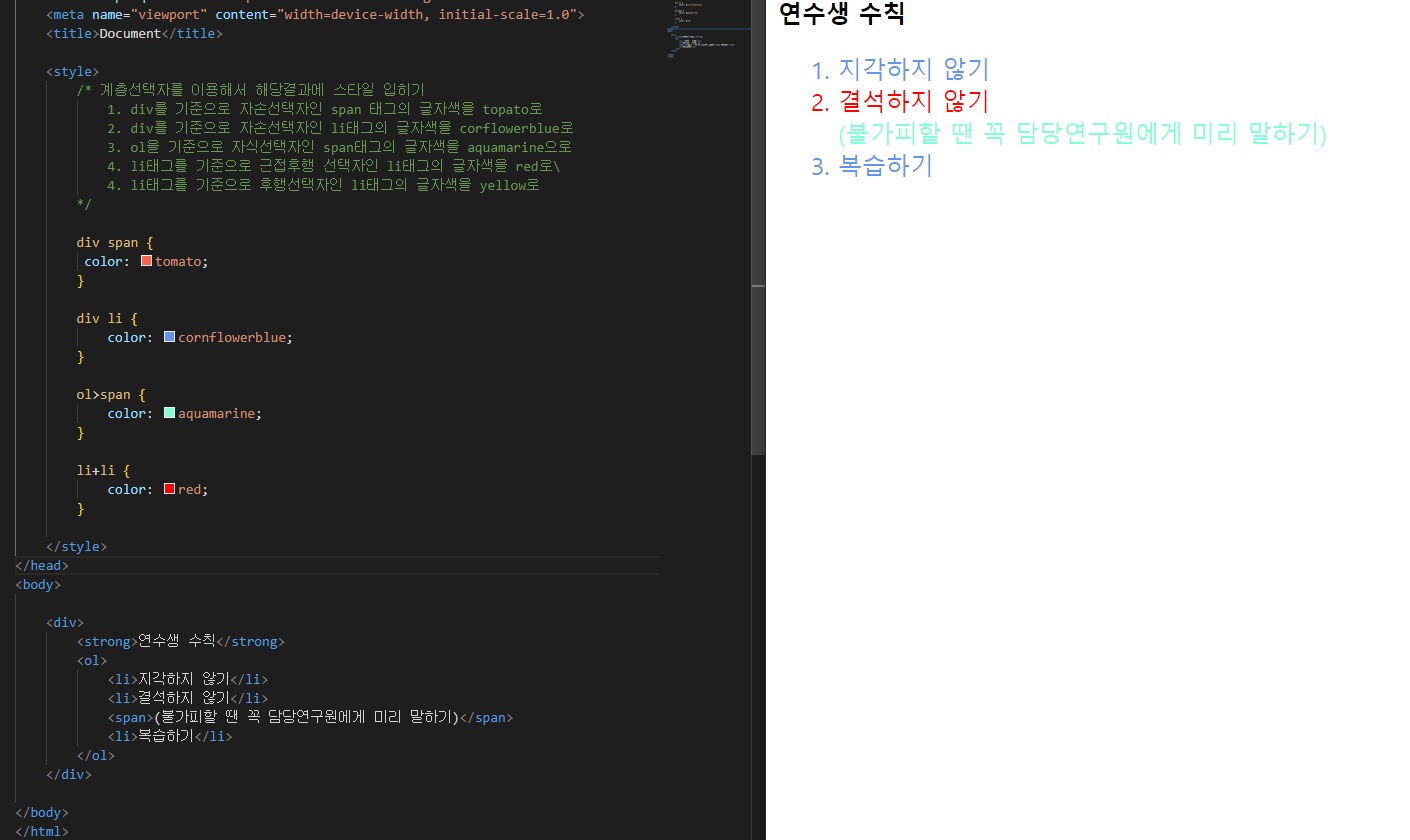 이런식으로 자손선택자와 자식선택자를 선택하는 방법이 다름