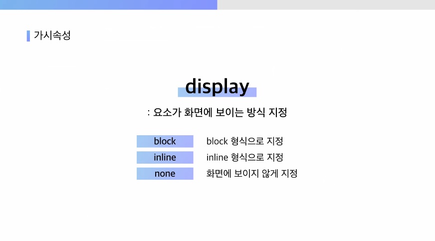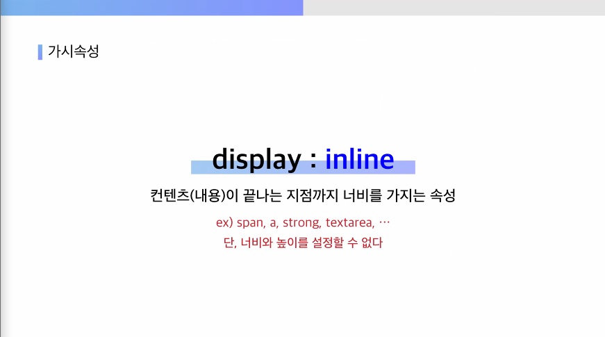 inline : 컨텐츠(내용)이 끝나는 지점까지 너비를 가지는 속성 -->> 너비, 높이 설정 불가 (영역이 정해져있으므로)