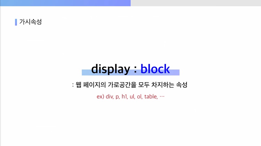 block : 웹페이지 가로공간 한줄 전체를 차지하는 속성 -->> width, height 설정가능