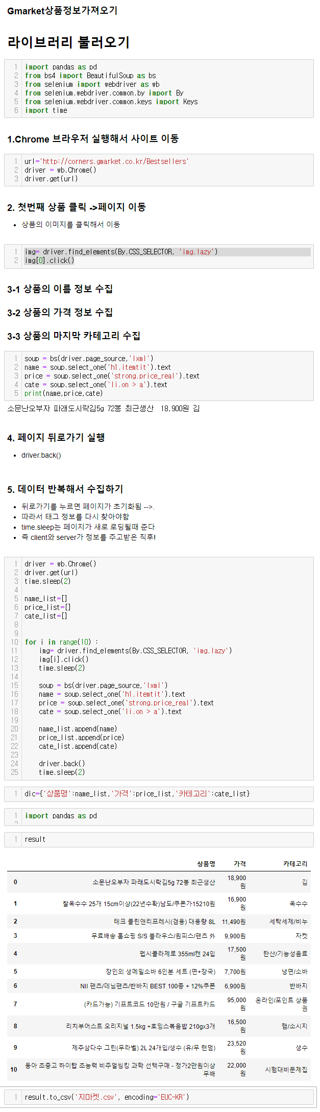 Crawling 지마켓 상품정보 가져오기 ( driver.back() ) by leehii 2022. 7. 7. 공유하기 게시글 관리 Coding Practice 저작자표시 (새창열림) 'Crawling' 카테고리의 다른 글 포켓몬 데이터 실습( os 라이브러리 : 파일, 폴더생성 / urlretrieve 라이브러리 : 이미지저장 / 파이썬 경로 입력 / isdir : 경로확인 / mkdir : 폴더생성 / 속성 src 추출 / 자동스크롤 ) (0) 2022.07.07 한솥도시락 메뉴 가격 데이터 수집하기 ( element와 elements / try와 except / time 라이브러리 ) (0) 2022.07.06 Selenium 라이브러리 설치 / 크롬 드라이버 설치 / 드라이버 실행하기 / (0) 2022.07.06 영화 리뷰 데이터 분석 실습 (0) 2022.07.06 영화 평점 데이터 수집 실습 ( list형태의 <태그> 결과값을 *[i].text로 바꾸고 새로운 list에 append하기 / list.set_index('name')으로 인덱덱스 번호 설정) (0) 2022.07.05 관련글 포켓몬 데이터 실습( os 라이브러리 : 파일, 폴더생성 / urlretrieve 라이브러리 : 이미지저장 / 파이썬 경로 입력 / isdir : 경로확인 / mkdir : 폴더생성 / 속성 src 추출 / 자동스크롤 ) 한솥도시락 메뉴 가격 데이터 수집하기 ( element와 elements / try와 except / time 라이브러리 ) Selenium 라이브러리 설치 / 크롬 드라이버 설치 / 드라이버 실행하기 / 영화 리뷰 데이터 분석 실습
