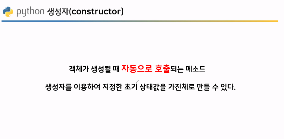 a 객체를 만드는 순간 생성자가 실행되고 self를 첫번째 매개변수로 받아