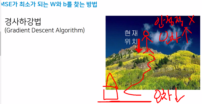 기울기가 낮은곳으로 계속 하강하며 a와 b의 값을 계속해서 변경하며 이동한다