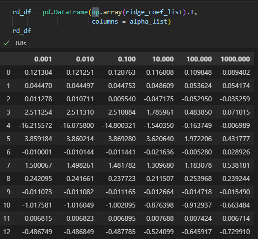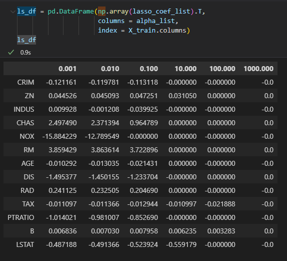 lasso는 0이 되지만 ridge는 0에 가까워질뿐 , 0이 되진않는 것이 확인됨