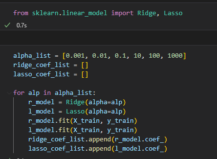 for문으로 alpha값에 따른 coef (기울기) = w 를 리스트에 담아 확인함
