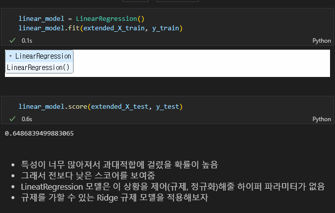 특성확장 전 상태 확인을 위해 linear 모델 객체를 생성하고