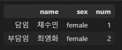 dict = { 'name' : [ '채수민', '최영화' ] , 'sex' : [ 'female', 'female' ], 'num' : np.array( [ 1, 2 ] ) }